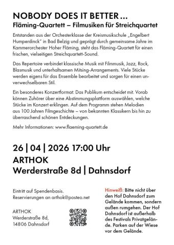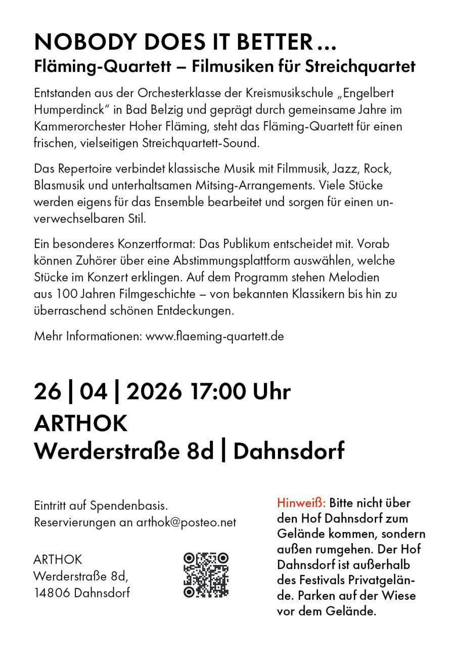 2009 haben wir unsere Ausbildung abgeschlossen in der 'Orchesterklasse' Kreismusikschule Engelbert Humperdinck in Bad Belzig. Nach einigen Jahren im Kammerorchester Hoher Fläming entwickelte sich damals das Projekt "Fläming-Quartett" mit dem Ziel, den leicht harzigen, antiquierten Sound des Streichquartetts mit anderen Ideen und modernen Stilrichtungen zu kombinieren. So entstand eine abwechslungsreiche Sammlung von Klassischer Musik, Trinkliedern, Blasmusik, Filmmusik, Mitsing-Nummern, Jazz und Rock. Und Schnulzen. Da man für eine Reihe von schönen Musikstücken keine geeigneten Quartett-Sätze findet, schreiben wir viele der Arrangements selber - so entspricht die Musik am ehesten dem Charakter unseres Ensembles. Und so hat sich auch unsere musikalische Leistungsfähigkeit mittlerweile auf gut überortsübliches Niveau entwickelt.